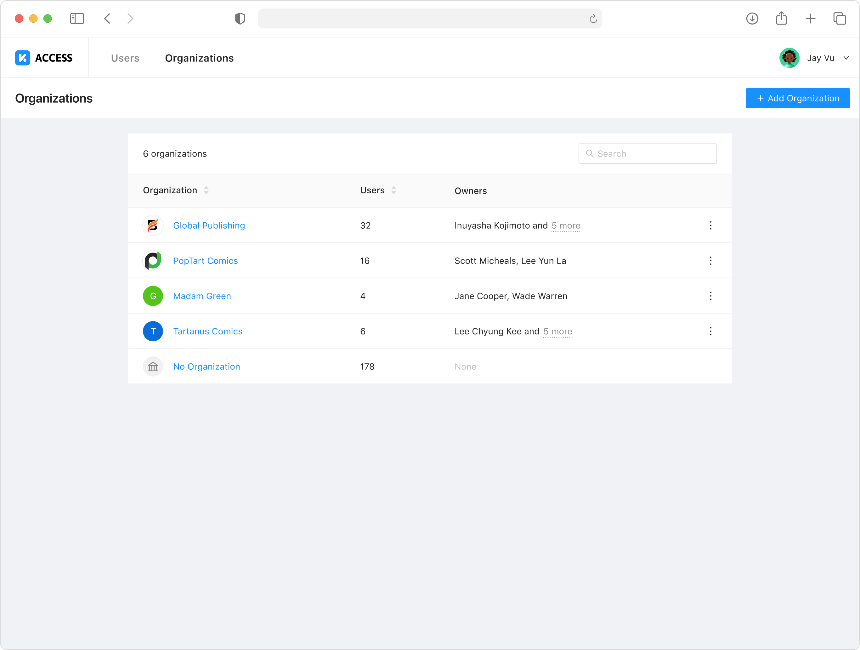- Person arrives at the Access Profile: see which role they have in the organization, see other organization members, see what tools they can access, and recent acitivites.