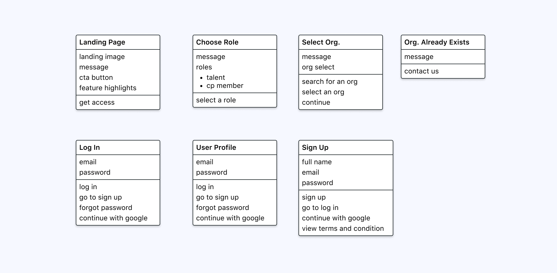 Based on the touchpoints illustrated above, I put down the screens and their required information.