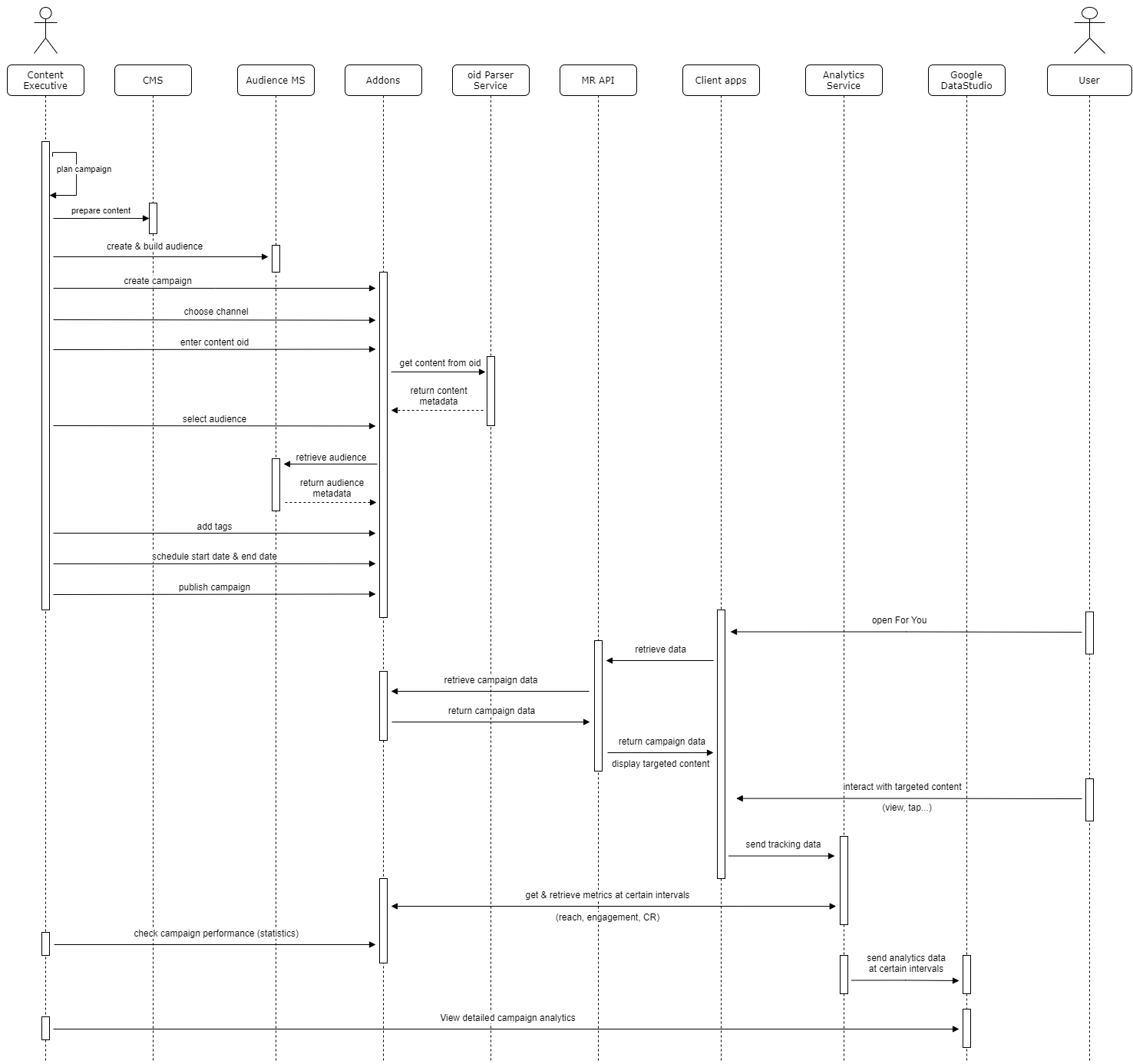 To illustrate the many systems involved in making this feature possible, I made a sequence diagram of the step-by-step process regarding how a content executive deal with campaigns.