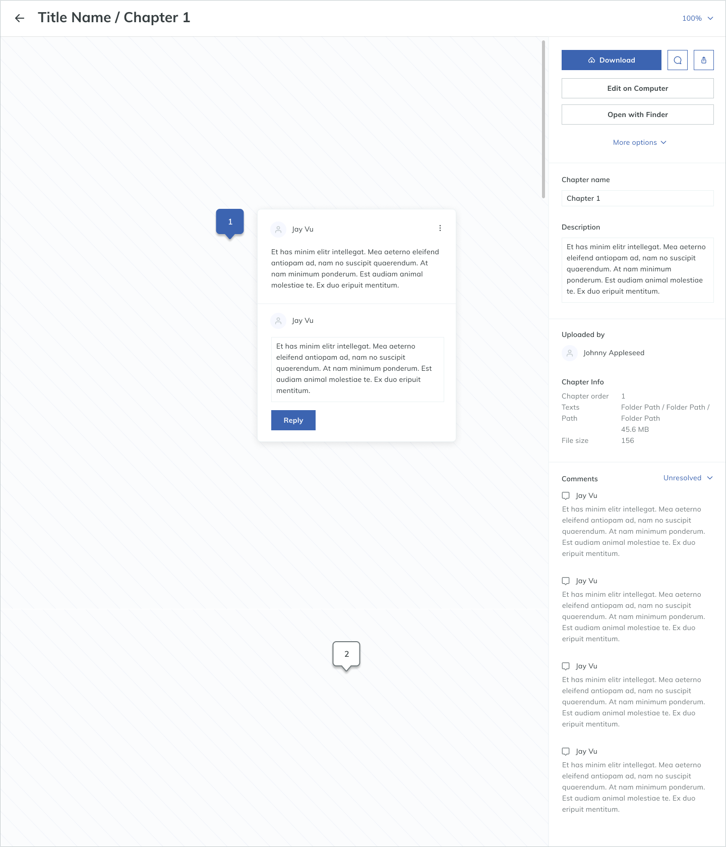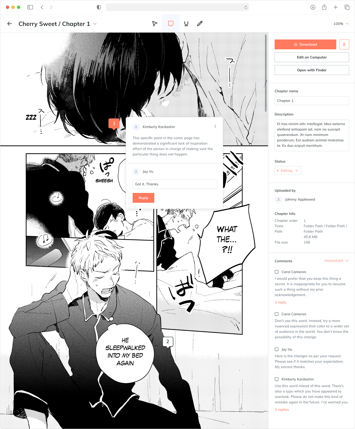 - Point out problems with the pages. If it's a typo, I want to highlight the typo and notify the writer about it. If it's a visual-related problem, I want to point at it, or mark the problem area and notify the artist. If it's other problems such as wrong page order or wrong chapter name, I want to leave a message for the whole chapter instead of individual pages.