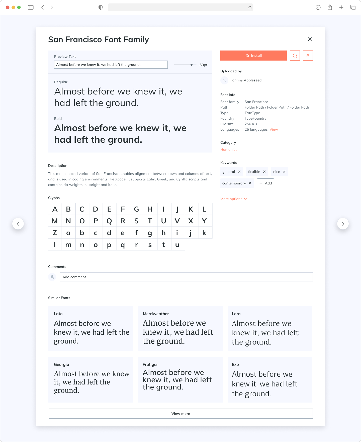 - View the details of the font to see if it fits my needs. It would be nice if I can type in some text to preview how it's rendered using the said font.