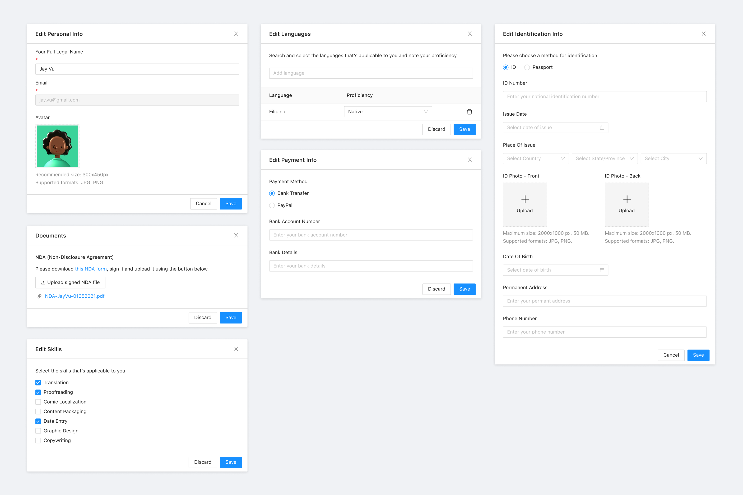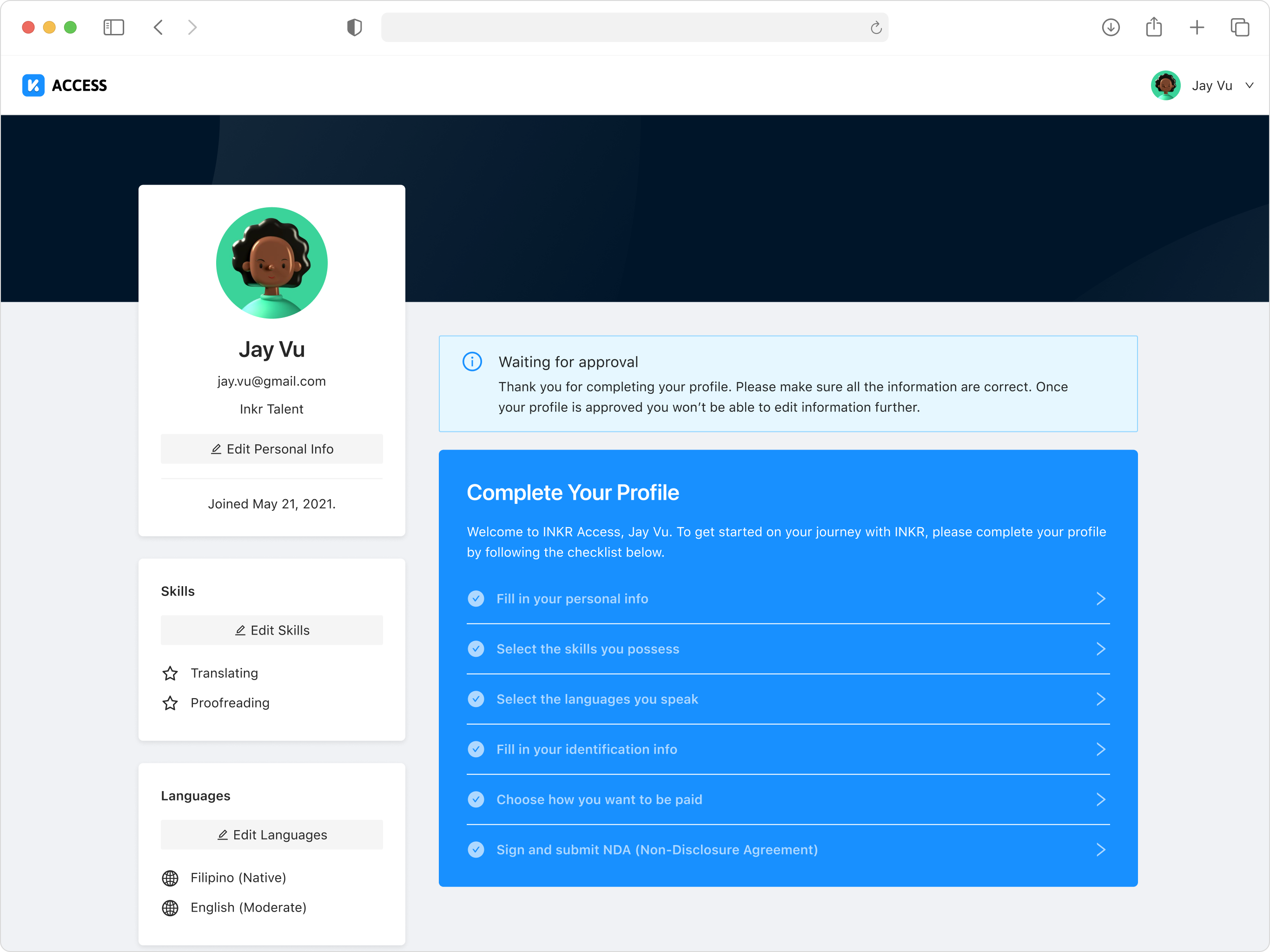 - Person arrives at the Access Profile, where they can edit their profile by providing necessary personal information, payment info, and documents such as NDA...
