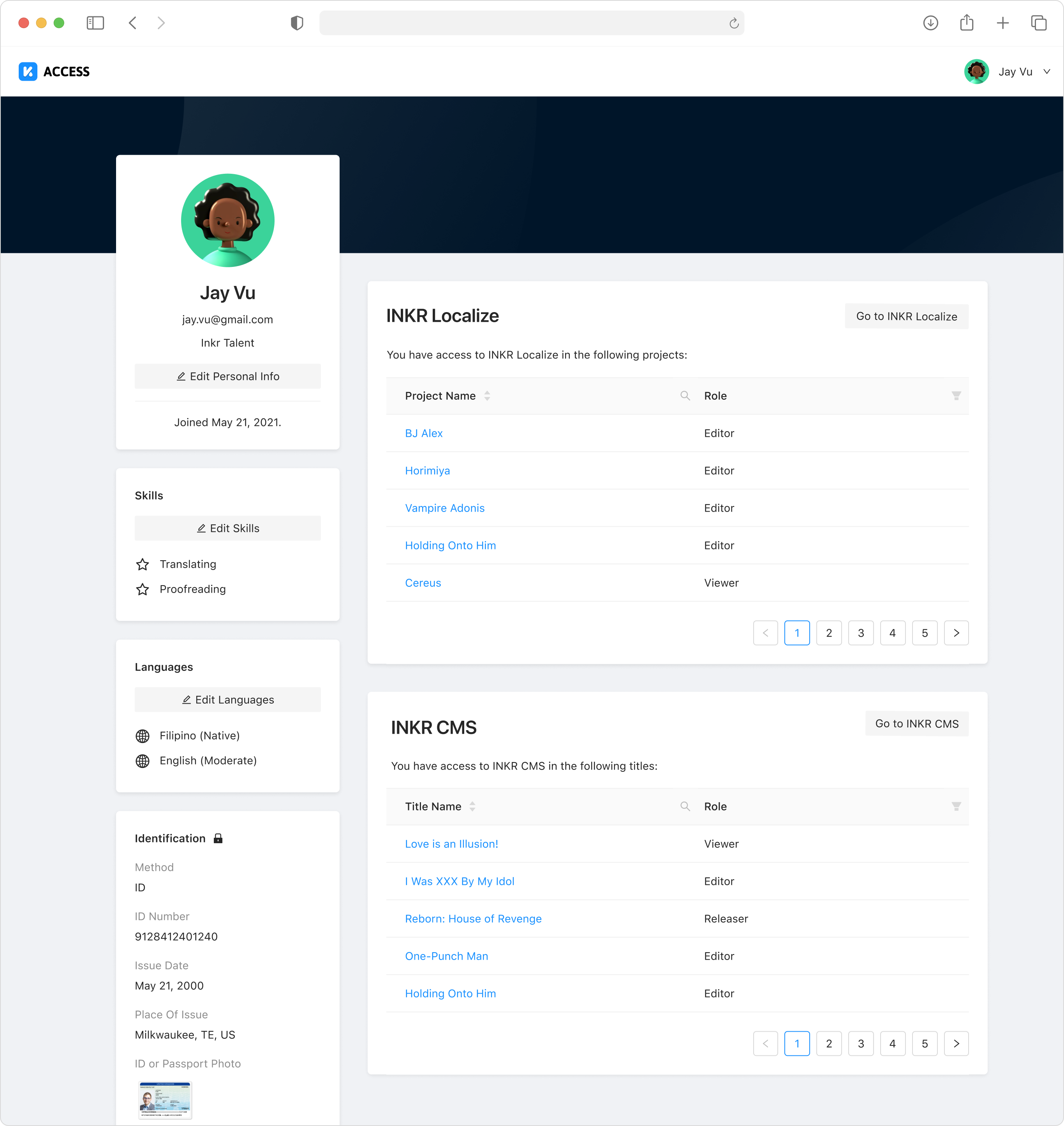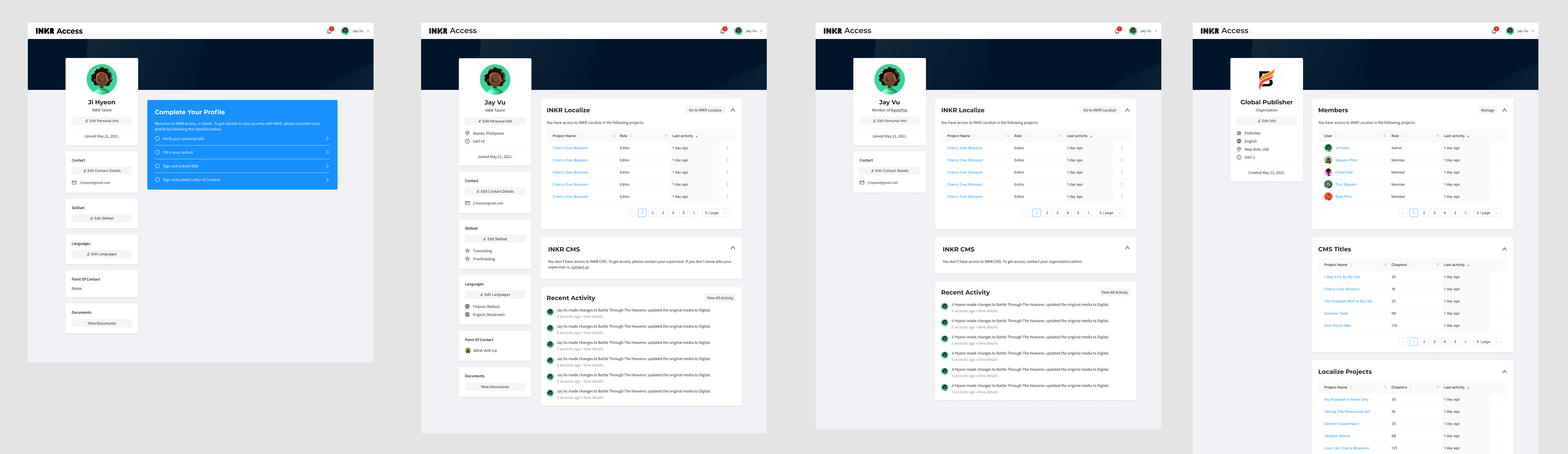 - Content Partner Team Members: personnels from INKR’s signed partners that need to log into CMS and LS for various purposes (monitoring production/localization, financial reports, downloading relevant data, etc.)