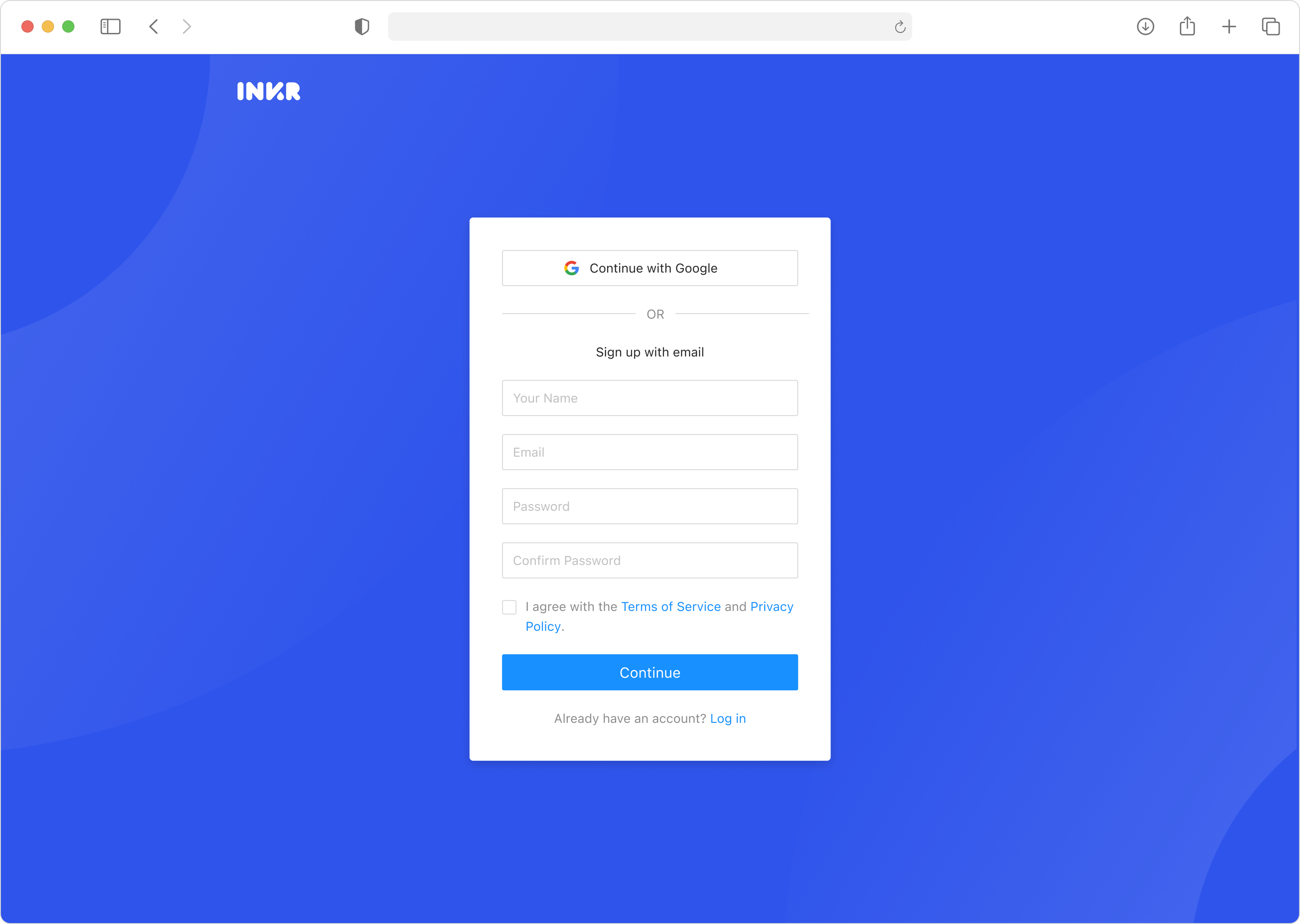 - Person clicks on email to open sign up flow on INKR Access: enter email, password and full name to authenticate