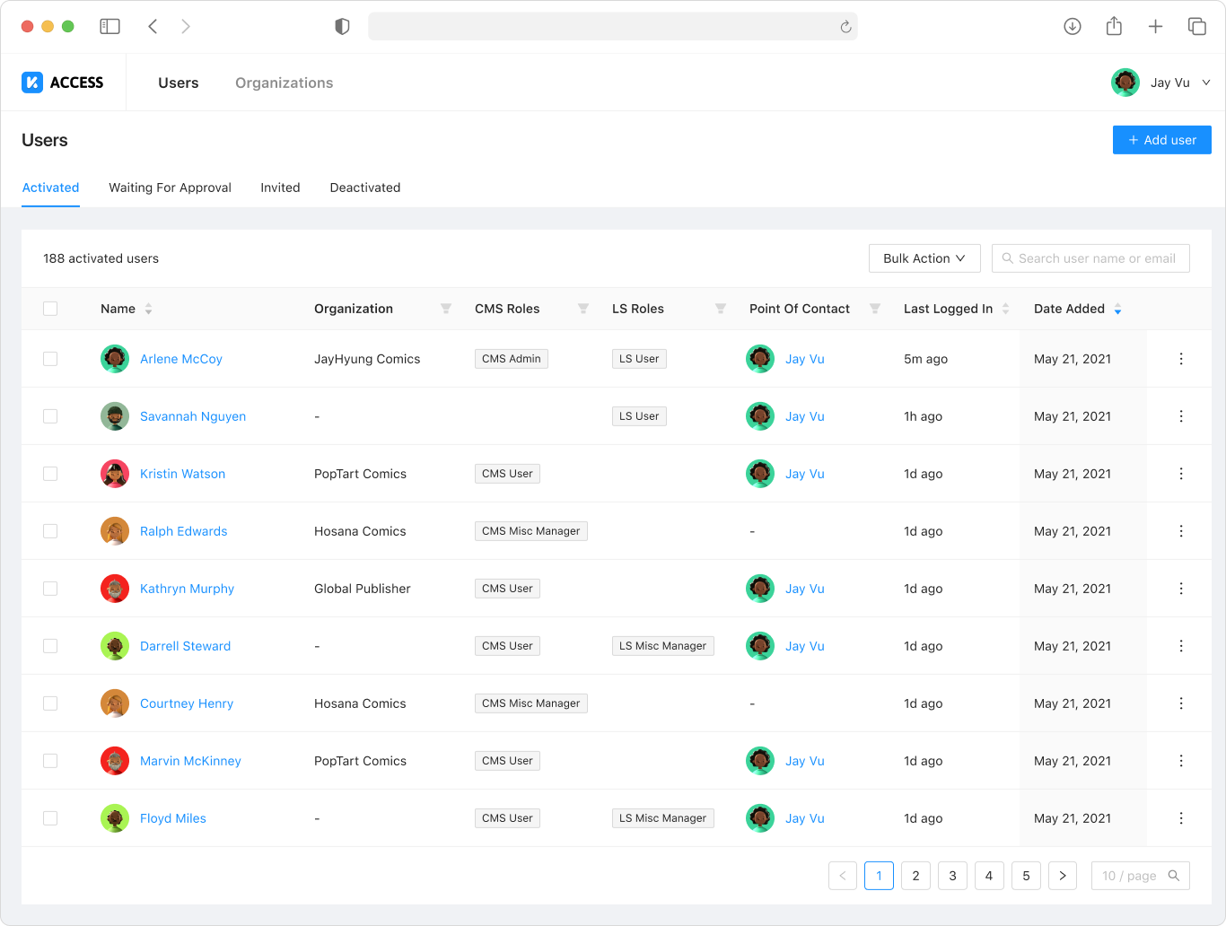 - Person arrives at the Access Profile: see which role they have in the organization, see other organization members, see what tools they can access, and recent acitivites.