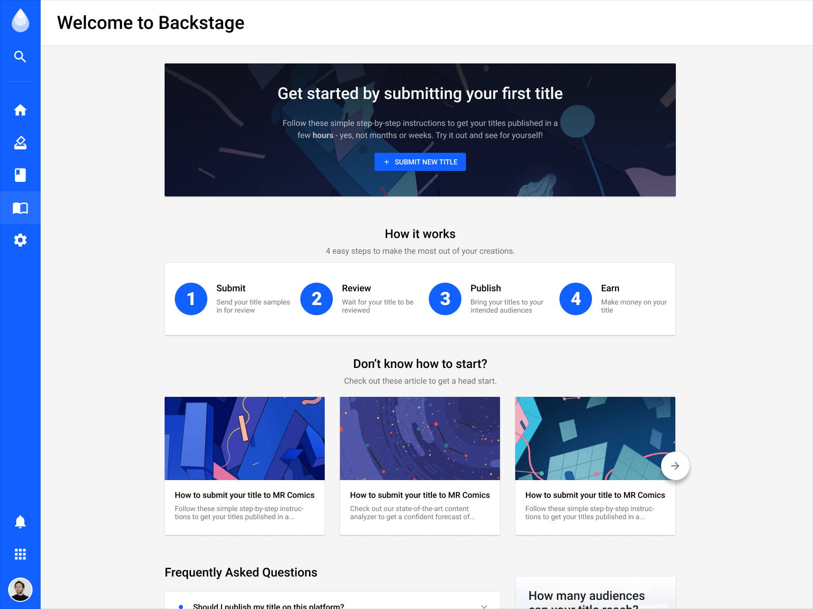 Unlike other publishing services, INKR Backstage features a 100% self-service portal for an end-to-end content publishing workflow from submission, publication, and monetization.