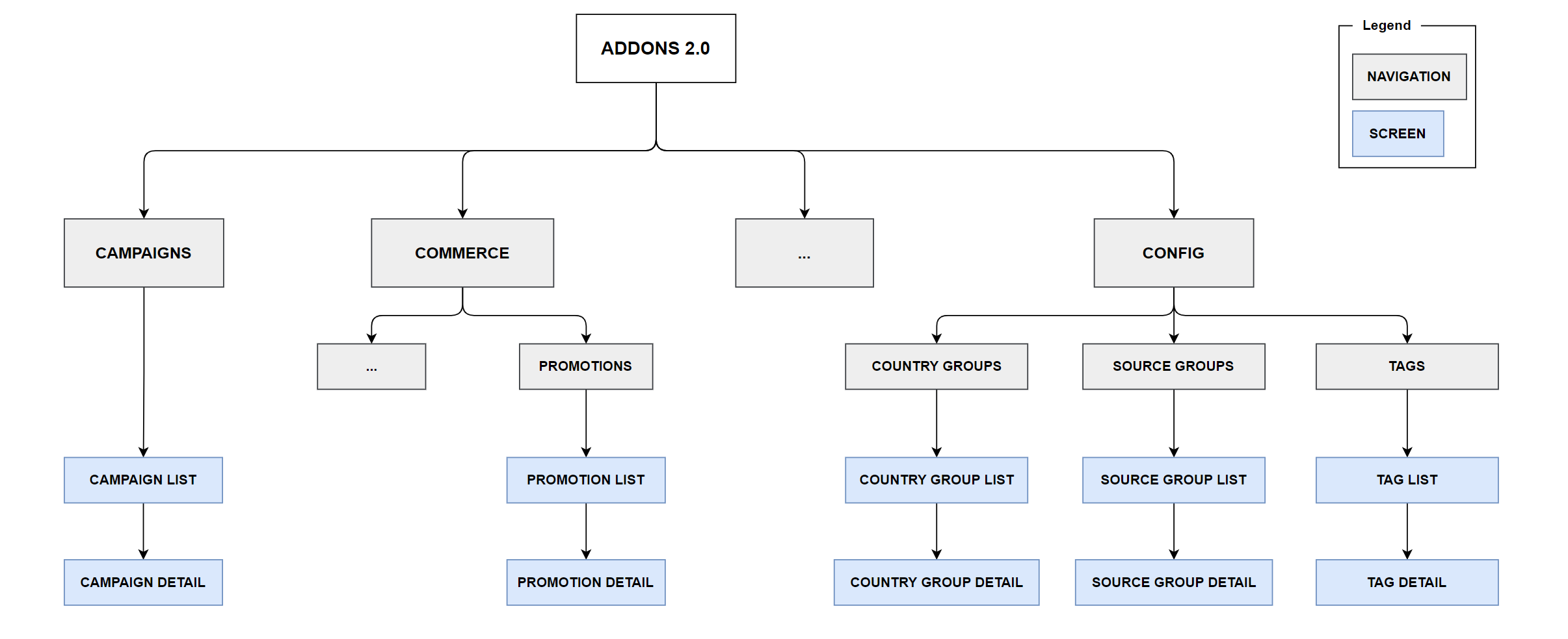 Below is a sitemap of how these screens will fit into the bigger picture of the Addons product.