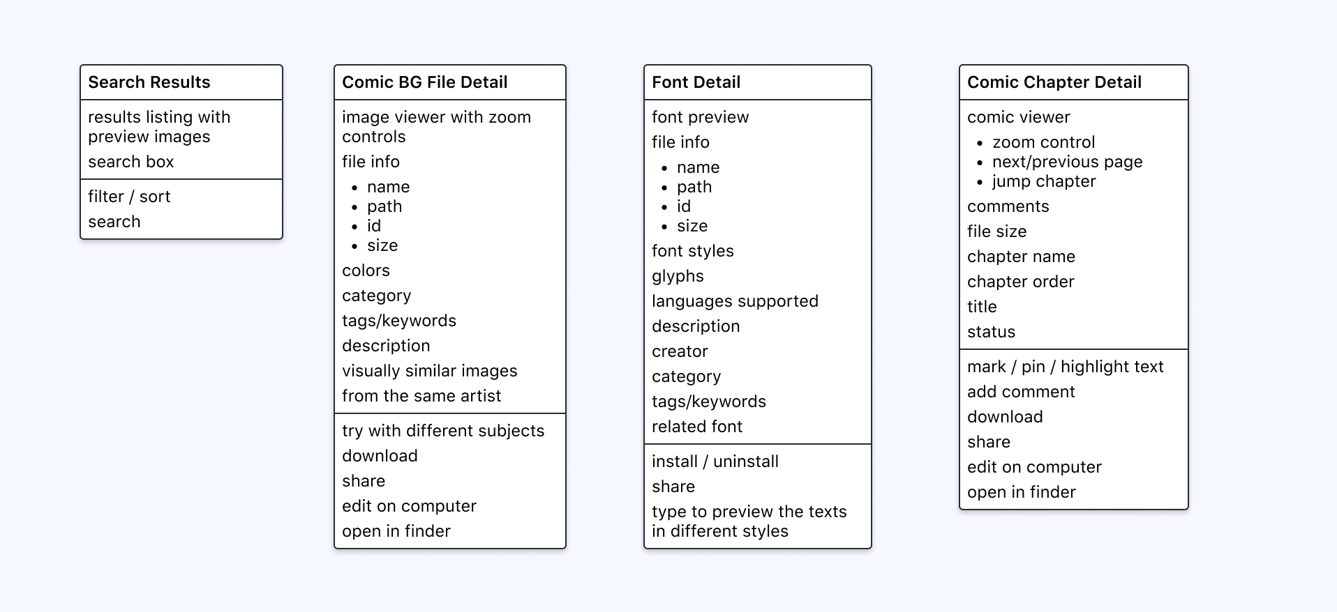 I have decided to skip the user flows as it is literally a 2-screens journey for all the 3 use cases above (one for search results and one for asset detail). Instead of user flows, I'm moving on to wireframes.